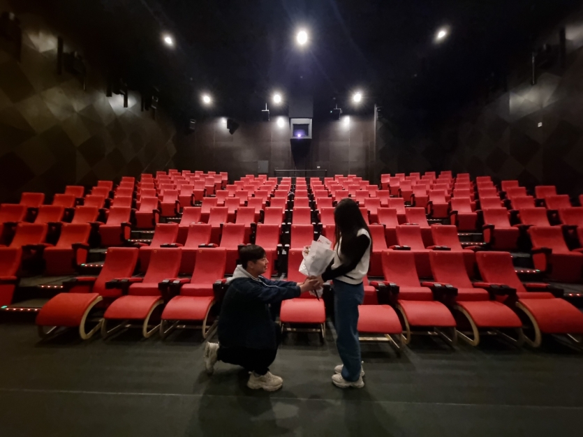 영화관 프로포즈를 진행하게 되었고, 영화 종료 후 제작한 영상이 상영되자마자 그때부터 여자친구는 눈물을 보이기 시작합니다.