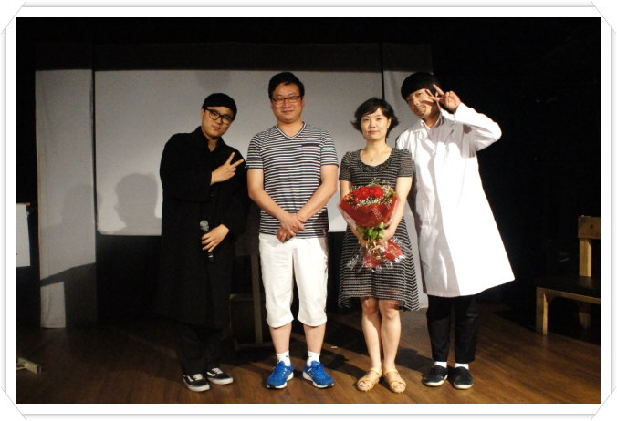 먼저이번 이벤트에 큰도움을 주신 정찬영 매니저님,, 제가 여러번 전화해서 이것저것 물어보고,,,귀찮게 해드림에 불구하구ㅡㅡ끝까지 친절하게상세하게 설명해주신 장유진 매니저님,정말 감사드립니다,,또한 연기자 여러분들 ,제 이벤트행사에 크게 호응해주신,,관객여러분에게감사말씀 드립니다...여러도움주신 분들덕분에 아주 만족스러운 이벤트를 할수있었습니다,,물론 아내도,너무너무 조아하구여,,,함께 참여하는 연극도 너무너무 잼있게 봤습니다,,첨에 너무쑥스러워 망설이기도 했지만, 하고 나니까,,역쉬 잘했다는 생각,,100번 잘했다는 생각뿐입니다,.혹시 이벤트를 계획하신 분이있다면,,망설이지마시고,,바로 실천하세요,,후회 안합니다,,,사랑하는 사람한테 이벤트란,,최고!!받는 사람도 기쁘지만,,해주는 사람의 기쁨이란..배가 됩니다,,암튼 저는 이번 이벤트로 인해 와이프한테,,점수좀 마니 따났습니다,,물론 아이들한테 진행 동영상 오늘 저녁에 보여줄 계획입니다,,저는 이벤트의 기운을 받아 몇년 아니 평생을 행복할거 같습니다,, 다시한번 관계자 여러분들에게 감사인사 드리며.....행복합니다!!!!!