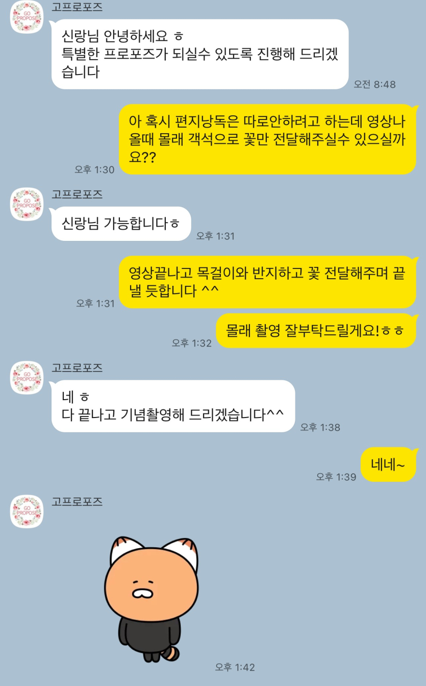영화관 프로포즈를 준비하면서 사전에 이것저것 정말 많이 연락드렸는데, 매번 친절하고 빠르게 답변해 주셔서 준비하는 내내 큰 마음의 안심이 되었습니다.